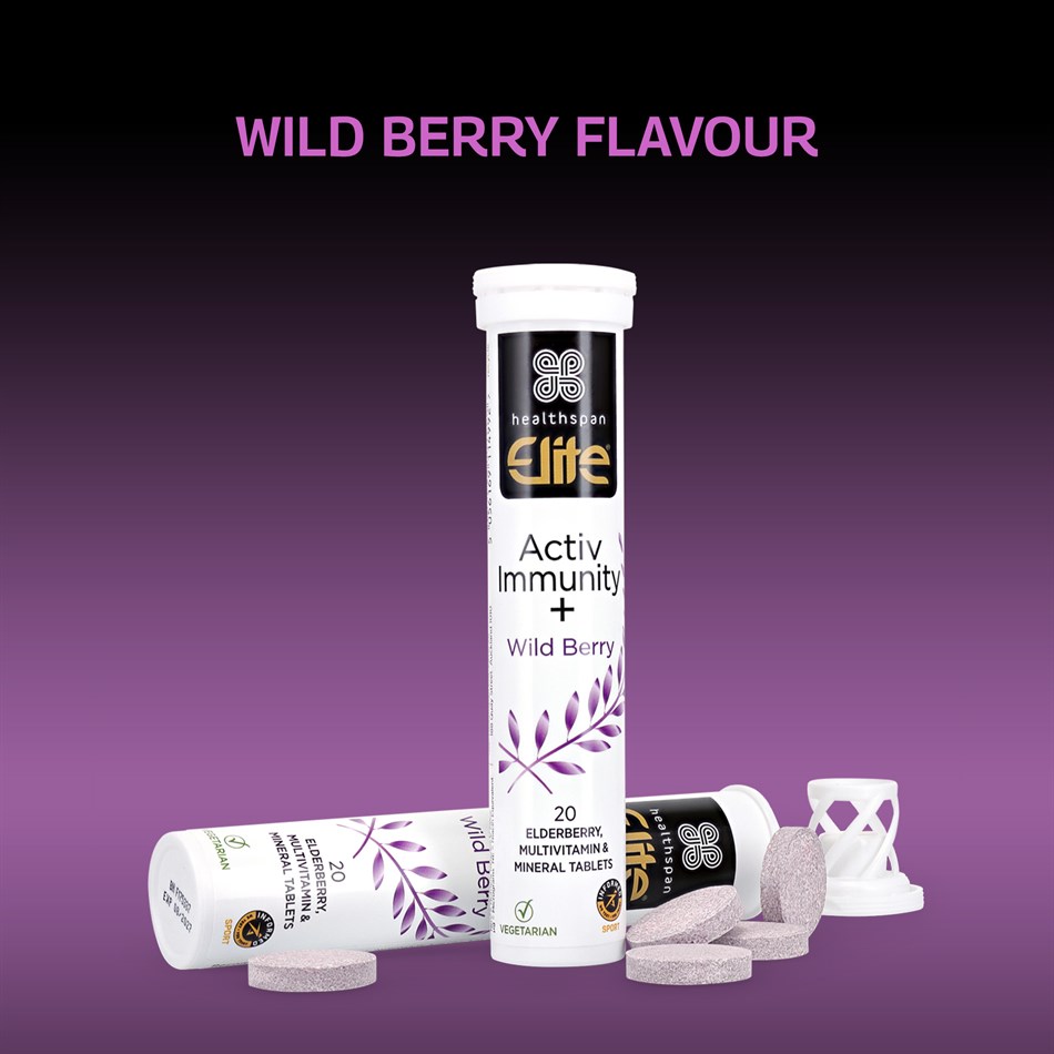 Activ Immunity + has been formulated to provide advanced daily nutrition support to support your immune system. Each tablet dissolves quickly in water to provide a delicious wild berry flavoured drink and contains 500 mg of the superfruit elderberry and 500 mg of vitamin C , widely known for its immune supporting benefits, particularly after periods of intense exercise.