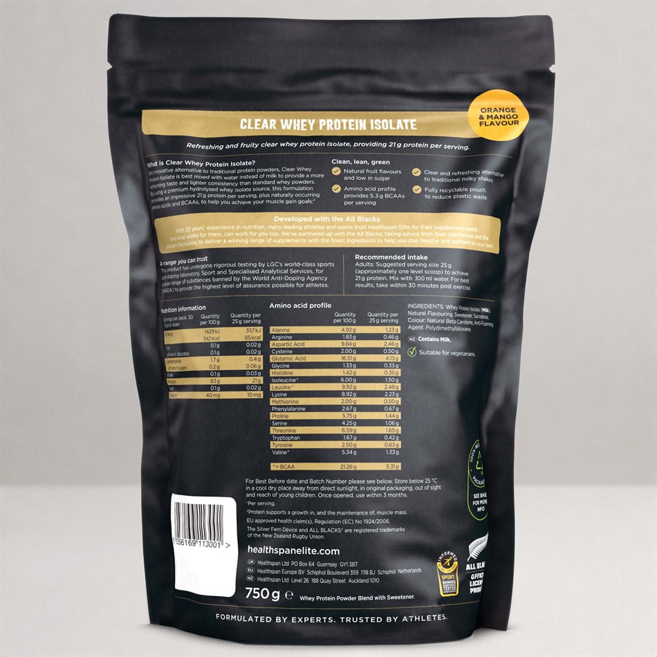 It was important for us and the All Blacks to launch a range that shared our mutual values. This led to the ‘clean, lean, green’ ethos: Clear Whey Protein Isolate is Informed Sport approved and contains natural flavours and a short ingredient list (Clean), with a science−backed formulation low in sugar to help you achieve your goals (Lean), within a fully recyclable pouch to help reduce plastic waste (Green).