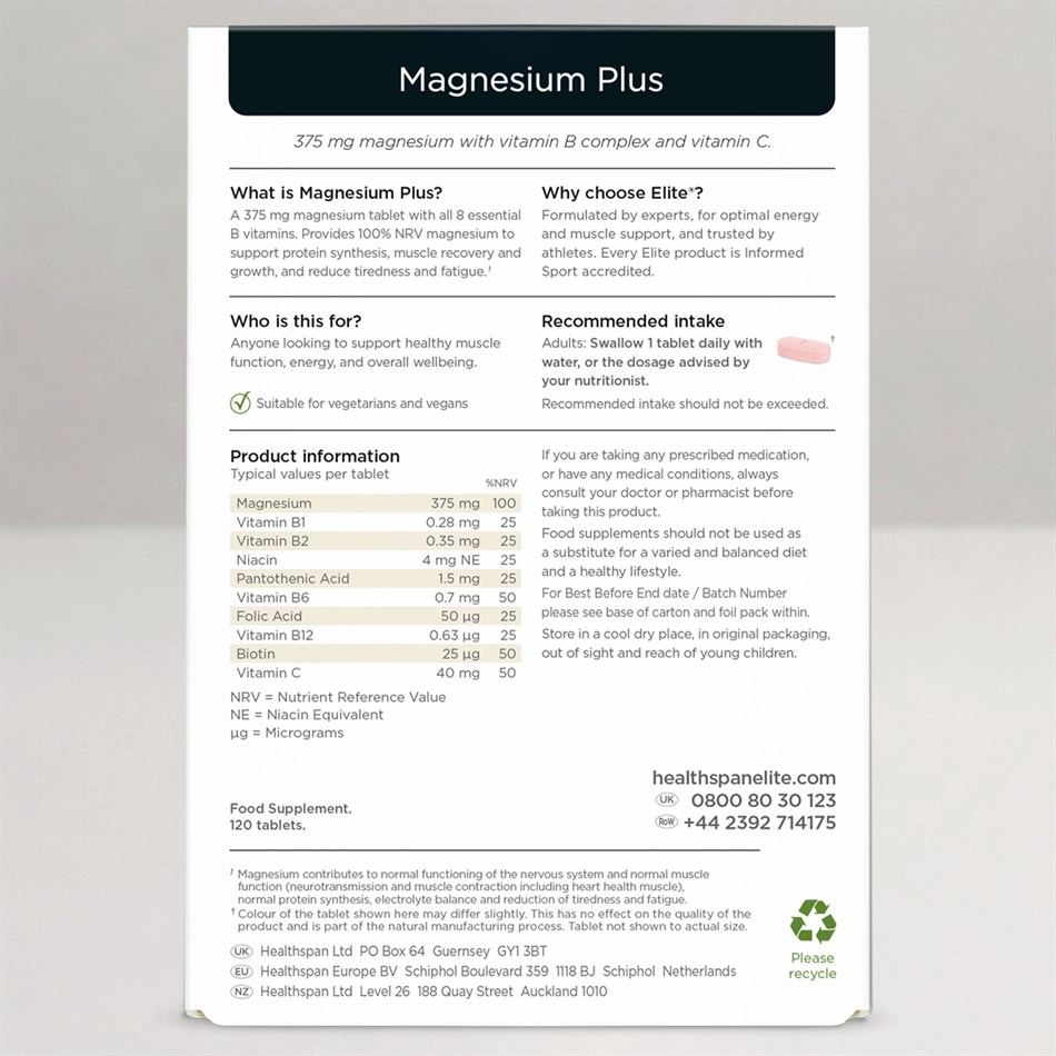 Magnesium plays a number of important roles within the body and is also crucial for protein synthesis which is vital for the growth of muscles. Each Magnesium Plus tablet delivers 375mg of magnesium as well as the entire family of B vitamins and at only 10p per day offers exceptional value for money.